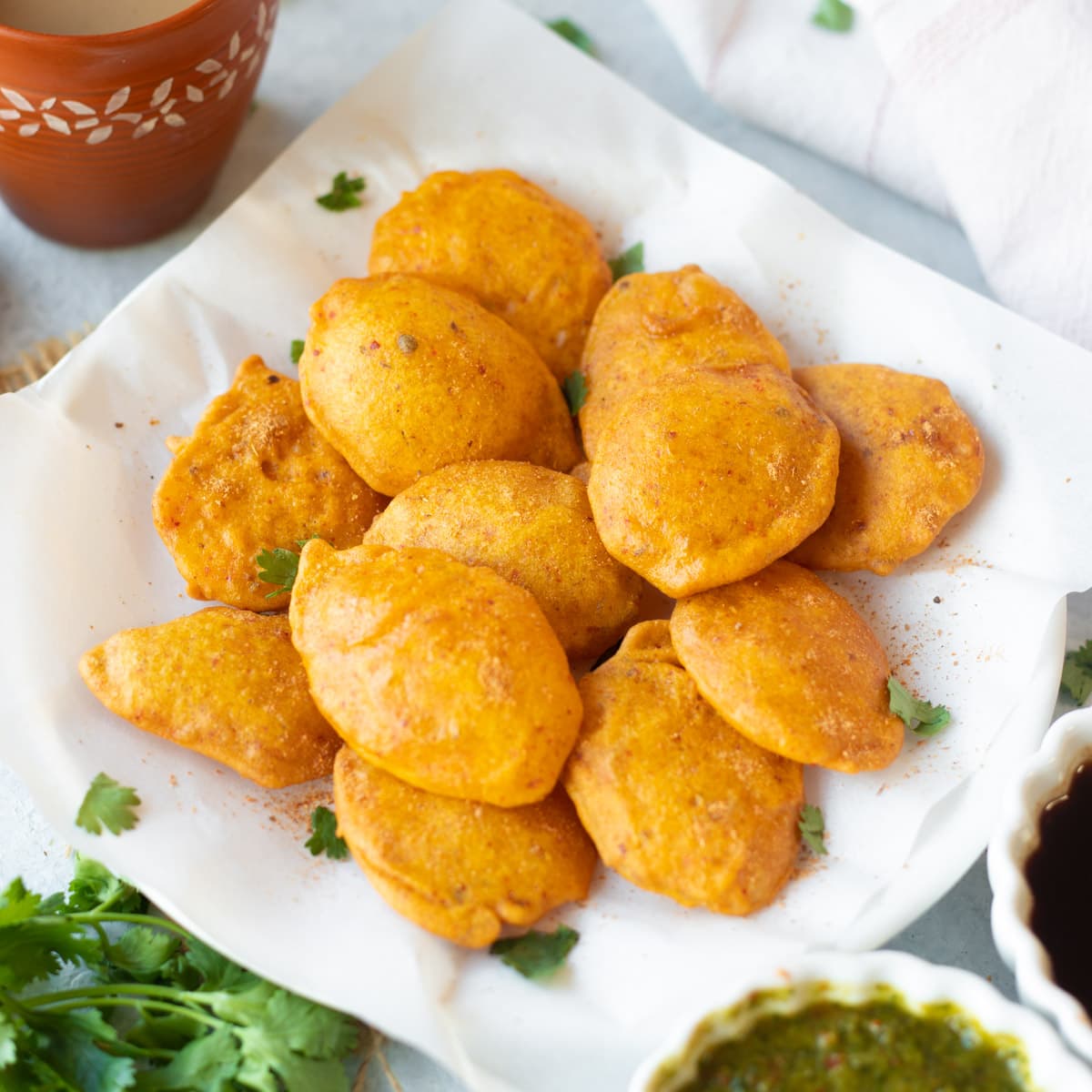 Les morceaux ainsi enrobés sont plongés dans de l’huile chaude et frits jusqu’à obtenir une croûte dorée et croustillante, puis servis avec des chutneys (menthe, tamarin) ou du yaourt épicé selon les goûts; selon les recettes, la pâte peut être ajustée avec du yaourt, de l’eau ou une légère levure chimique pour plus de légèreté. Allant des versions plus simples à des variantes régionales, le plat peut aussi inclure des touches supplémentaires d’épices ou d’herbes selon les préférences du chef.