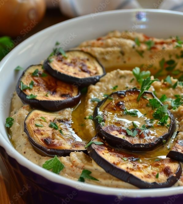 • Caviar d’aubergine : Purée d’aubergine grillée aux dés de poivron, huile d’olive, citron (50g par personne)