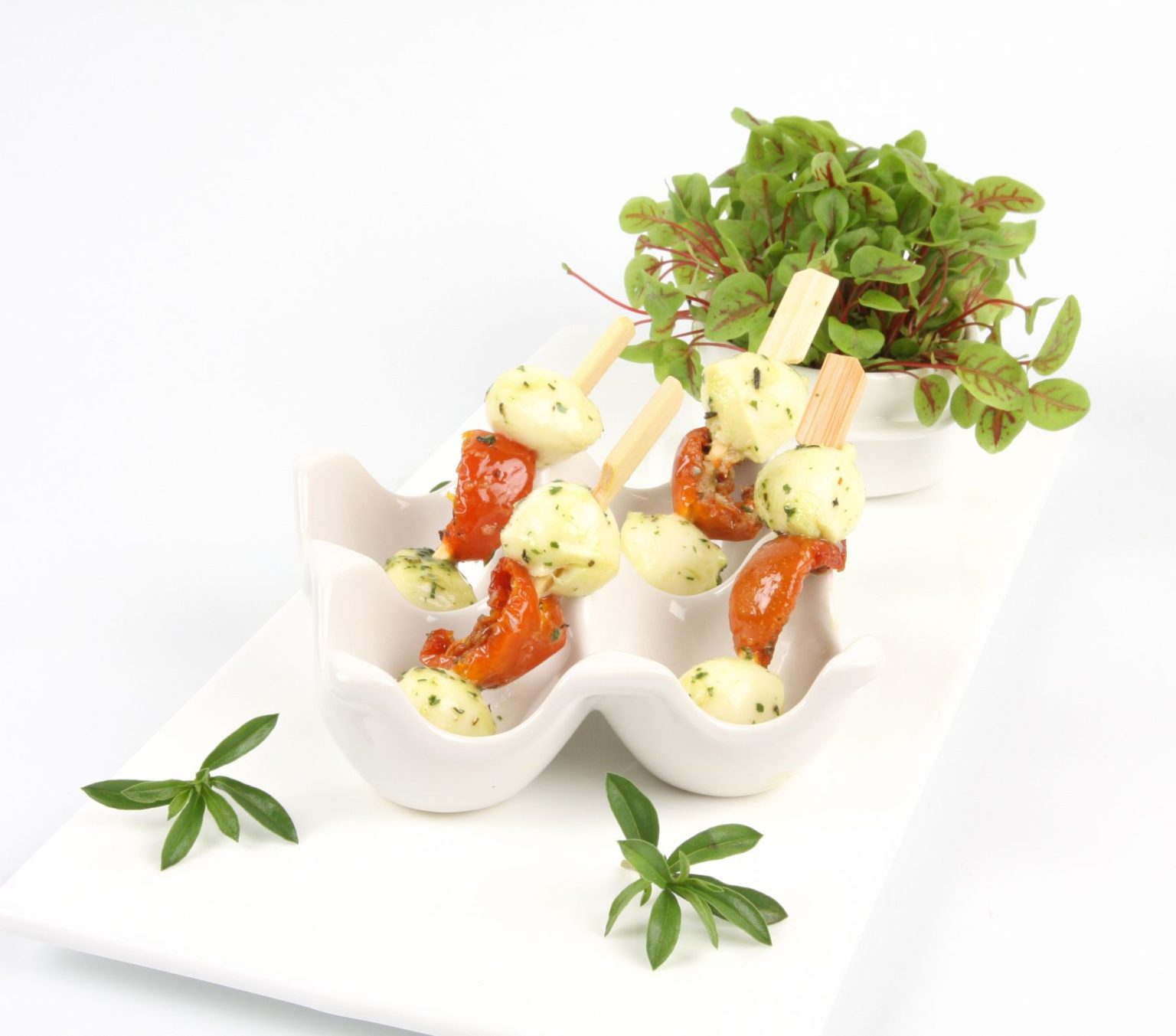 Le mariage parfait entre des quartiers de tomate confite et des billes de mozzarella. Tout ça mariné dans l’huile et des herbes. C’est l’Italie en brochette !