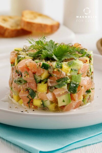 - Tartare de saumon : Tartare de saumon et des morceaux de mangue assaisonnées.