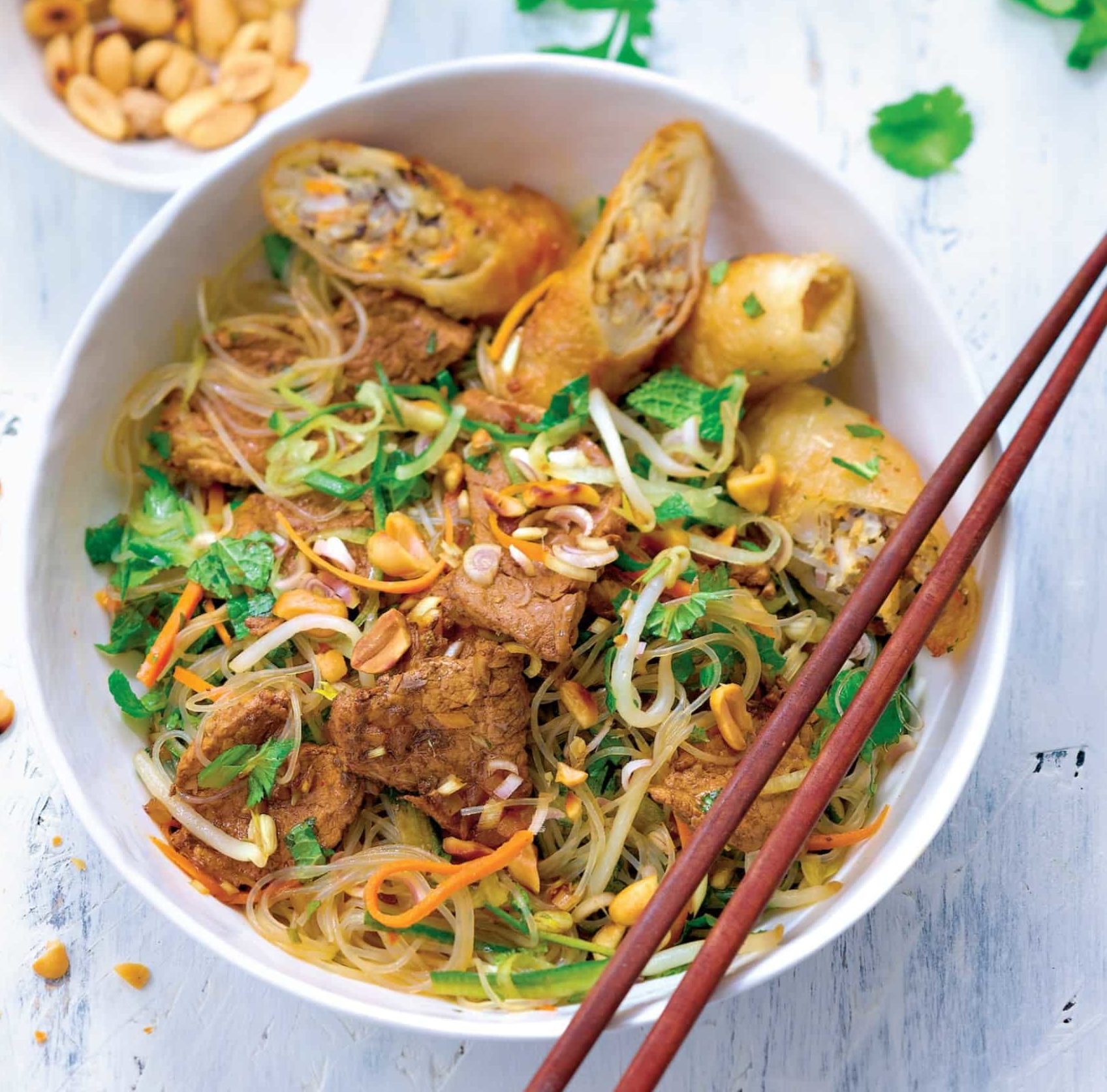 - Bo Bun : Vermicelles de riz, salade de soja frais, bœuf aux oignons frits marinés à la citronnelle, accompagnés de nems “maison”.
