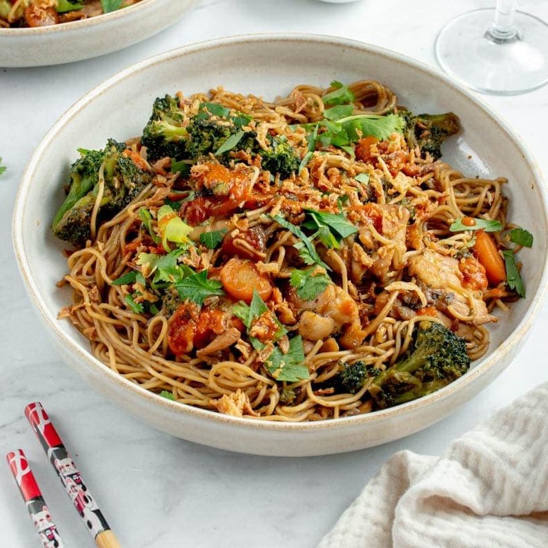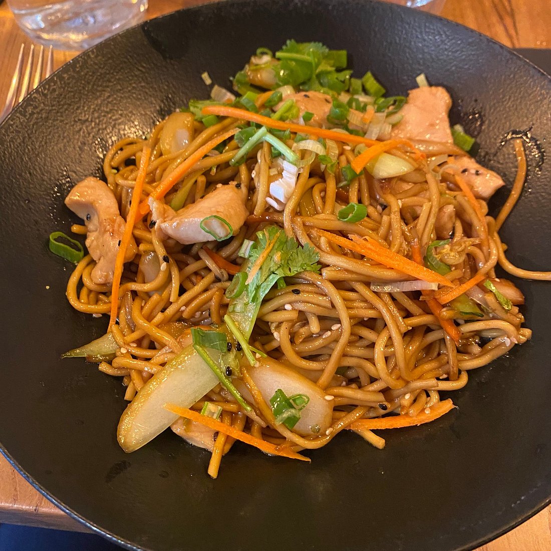 - Udon Ji Pai : Grosses nouilles de blé Japonaises sautées aux légumes de saison, accompagnées de poulet croustillant.