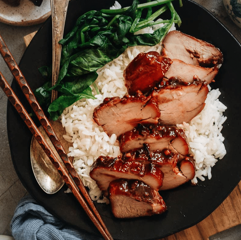 - Cha shao fan : Riz parfumé sauté aux œufs et à la ciboulette, accompagné de “porc laqué” par nos soins.