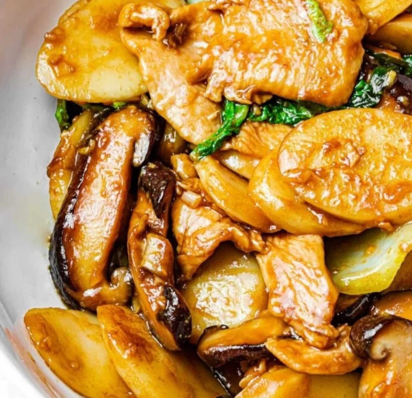 - Chao nian gao : Pâtes de riz tranchées, sautées aux champignons parfumées, accompagnées de “porc laqué” par nos soins.