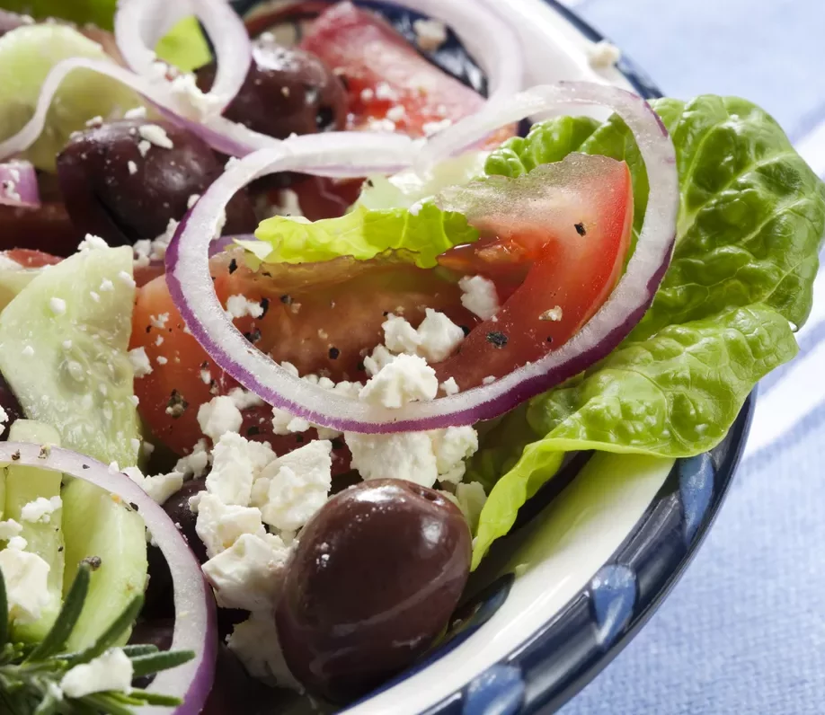 - SALADE GRECQUE : concombre frais, de tomates fraîches, d’olives Kalamata, de dés de Féta, de boulgour et d’oignons, sauce vinaigrette au vinaigre de Xérès.