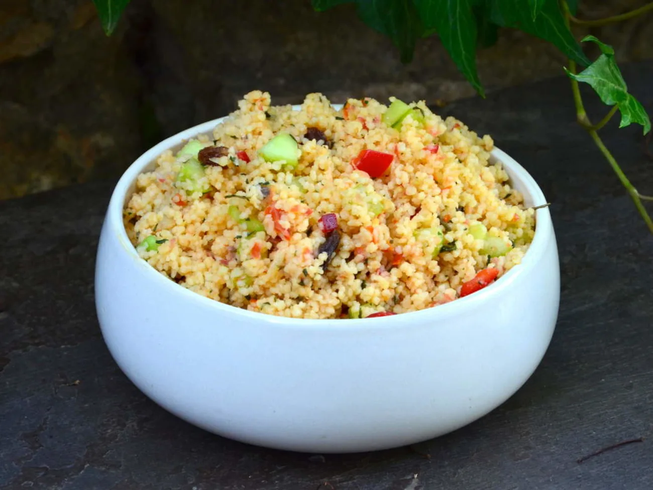 - TABOULE ORIENTAL A LA MENTHE : semoule de blé, poivrons rouges et verts, de tomates, de menthe, d’oignons et de persil, sauce vinaigrette avec de l’huile d’olive et des épices.