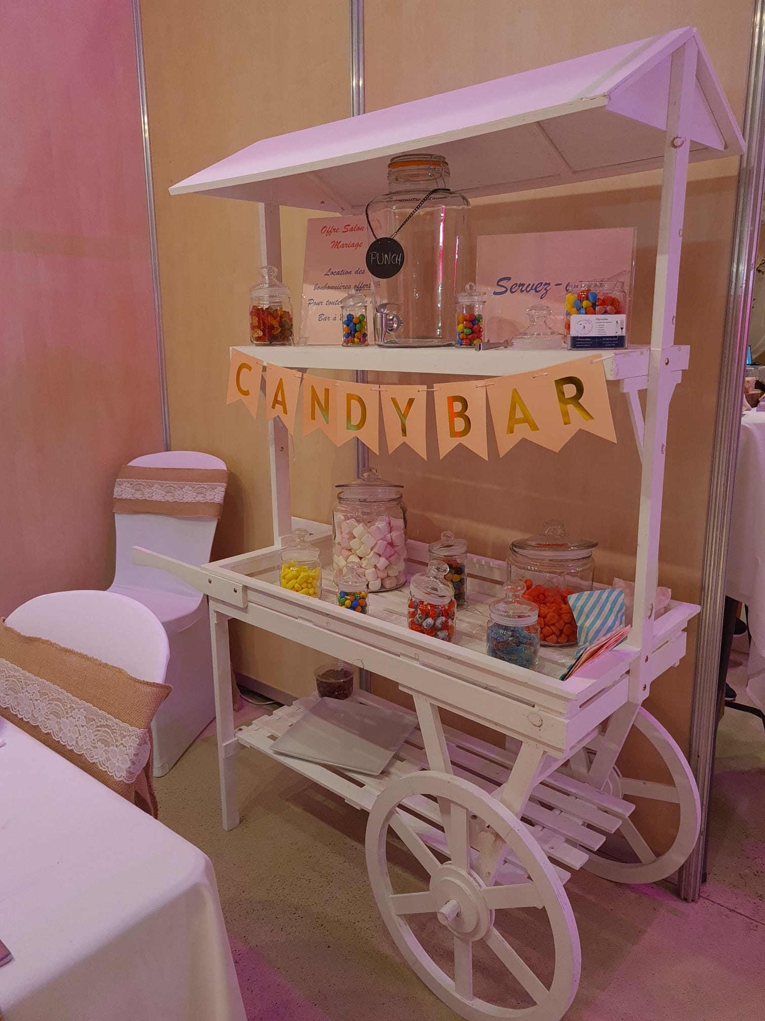 Candy bar (avec bonbonnières). Agrémentez le avec vos couleurs pour un bar à bonbons qui vous ressemble. Bonbons non fournis