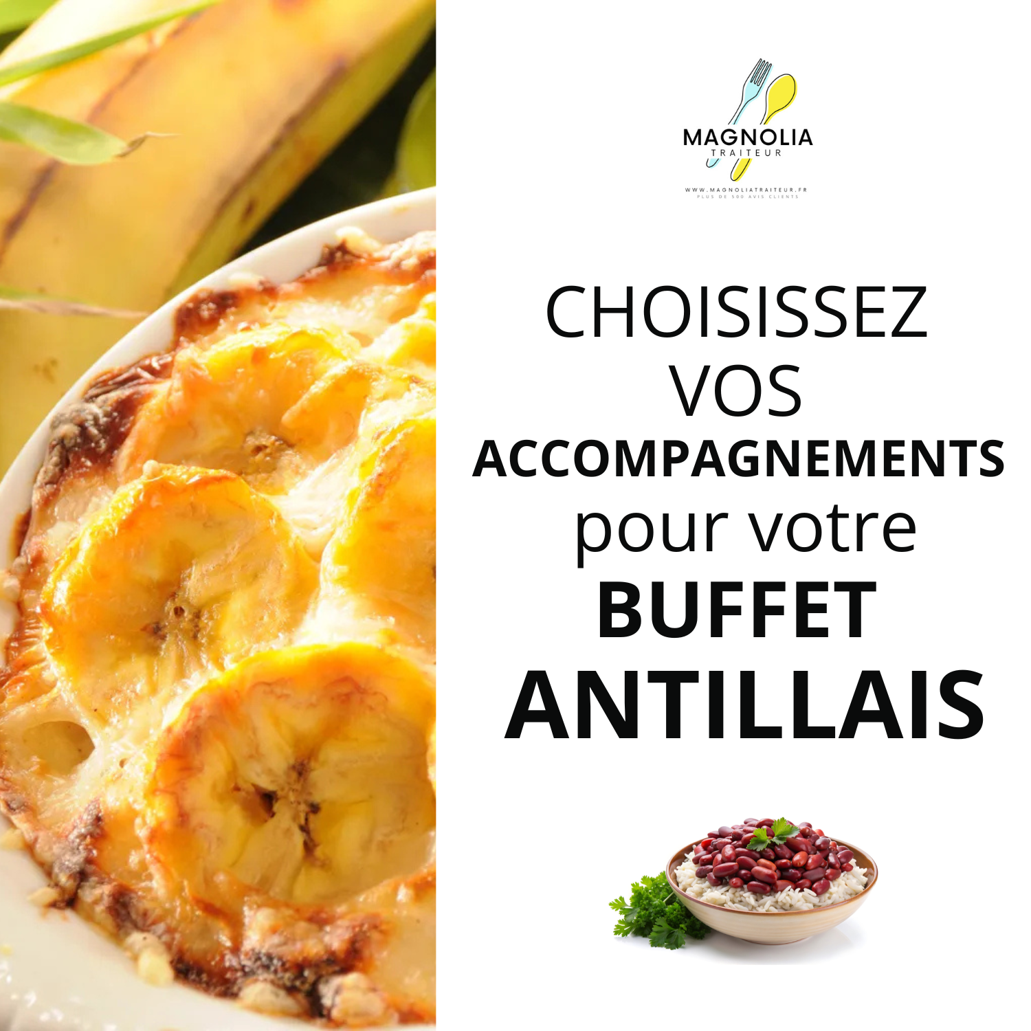 Pour sublimer vos buffets antillais sur Magnolia Traiteur, découvrez une sélection d’accompagnements conçus pour apporter couleur, texture et équilibre à votre menu: riz antillais parfumé (lait de coco et épices) et riz blanc léger; gratin d’ignames et gratin de patates douces; haricots rouges mijotés; achards de légumes antillais; bananes plantains dorées (frites ou grillées); et une variété de légumes croquants sautés ou grillés. Ces accompagnements s’adaptent facilement à vos plats principaux et permettent de composer un buffet harmonieux en toute simplicité.
