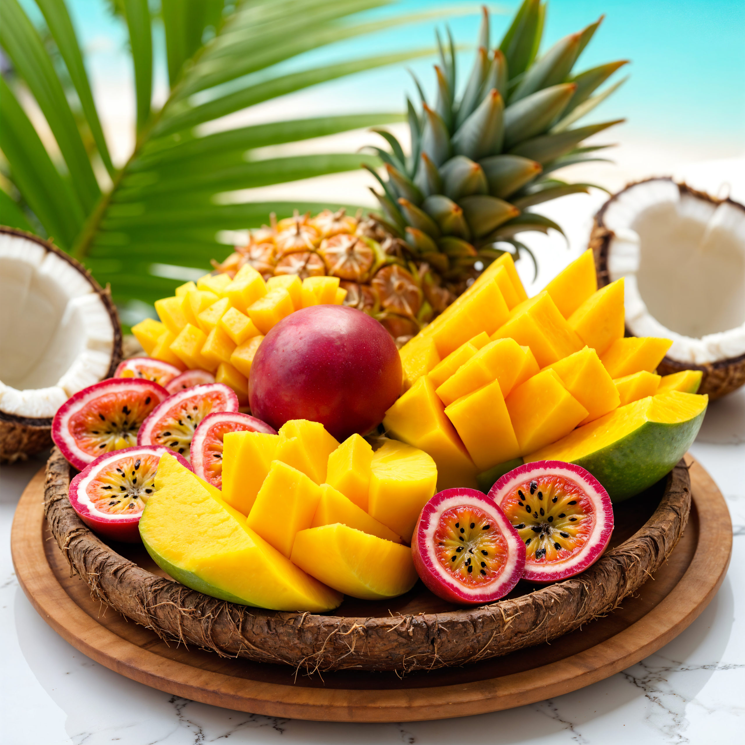 Ananas, bananes, mangue, fruits de la passion, grenade, kiwis jaune, kiwis vert, pomelos chinois, papaye.