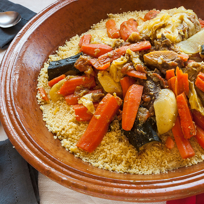 Des grains de semoule cuits à la vapeur, parfaitement gonflés, accueillent un mélange de légumes croquants de saison – courgette, carotte, poivron et pois chiches – le tout relevé par une sauce parfumée aux épices méditerranéennes pour une harmonie chaude et savoureuse.