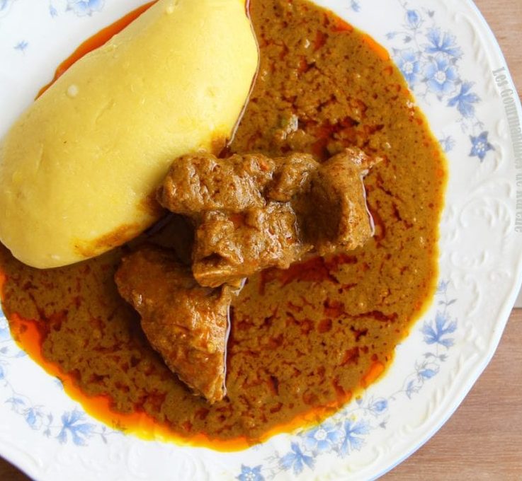• Foutou banane (plantains) ou foutou manioc (manioc) écrasé et travaillé avec de l’eau chaude