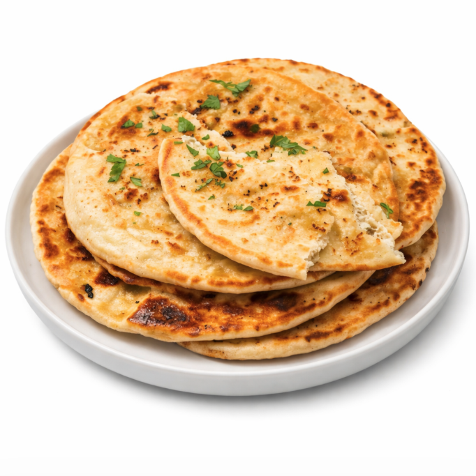 Le garlic naan est une variante aromatique du naan traditionnel, préparé avec une pâte à base de farine de blé (gluten), d’eau et de sel, à laquelle on peut ajouter du yaourt et/ou du ghee pour plus de tendreté et de richesse; l’élément distinctif est l’ail, soit incorporé dans la pâte sous forme de pâte d’ail, soit badigeonné sur la surface avec du beurre fondu avant ou après cuisson, pour un parfum intense. La pâte est ensuite pétrie, laissée à lever, étalée en disque et cuite dans un tandoor, sur une tawa ou dans un four très chaud jusqu’à obtenir une mie moelleuse et une légère dorure sur les bords. Servi chaud, le garlic naan accompagne parfaitement currys, dal et plats en sauce, et peut être agrémenté de coriandre ou d’œufs de persil selon les recettes.