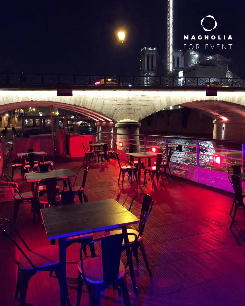 Elle vous accueille dans un espace original, avec sa grande terrasse à votre disposition. En même temps, elle offre un vaste espace intérieur, complètement modulable pour l’ambiance de votre choix et peut vous accueillir en mode cocktail, buffet dinatoire ou tout autre configuration,