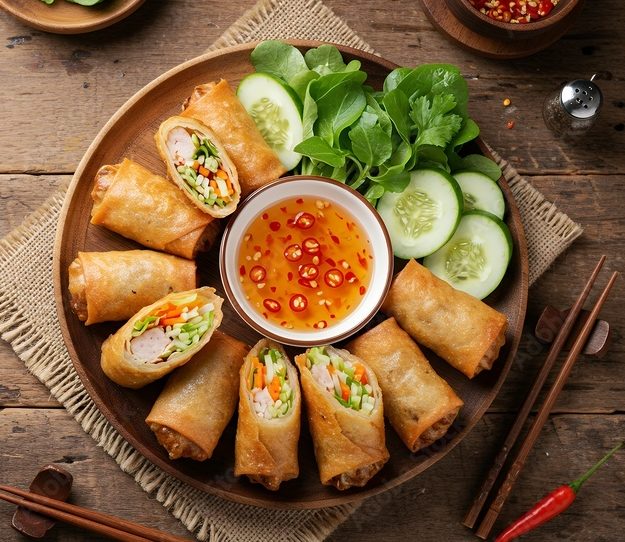 Nos nems aux crevettes sont des rouleaux croustillants, dorés à souhait et généreusement garnis de crevettes tendres, de légumes croquants et d’herbes aromatiques, enveloppés dans une pâte fine et frits à la perfection. Servis avec une sauce nuoc cham relevée ou une sauce aigre-douce, ils apportent une touche asiatique élégante à buffets, cocktails ou repas d’entreprise: faciles à partager