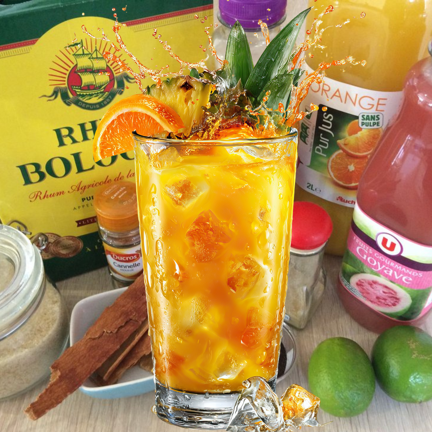 - Ce planteur est préparé à base de rhum 3 RIVIÈRES ou RHUM BOLOGNE à 50°, de jus d’ananas, d’orange, de goyave et de sirop de canne, Canelle, citron verts , tous des produits de qualité.