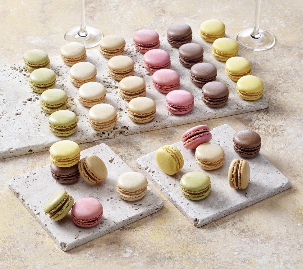 Chaque macaron est composé de deux coquilles croquantes aux amandes qui entourent une garniture fondante : crème au beurre, ganache ou compotée de fruits.