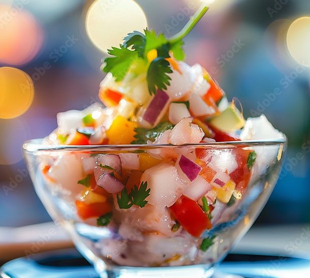 - Céviché de filets de bar aux zestes d’agrumes et mangues rôties, gelée fraîche à la menthe et citron caviar