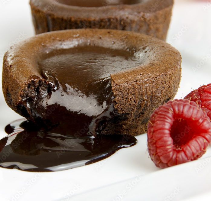 - Mi-cuit au chocolat aux éclats de praline rose, crème anglaise vanillée.