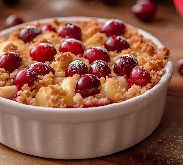 - Crumble de pommes aux raisins confits, espumas de crème légère.
