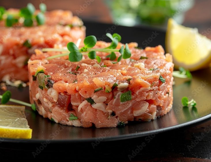- Tartare de saumon mariné aux cinq baies, sauce aux appétits et croquant de fenouil.