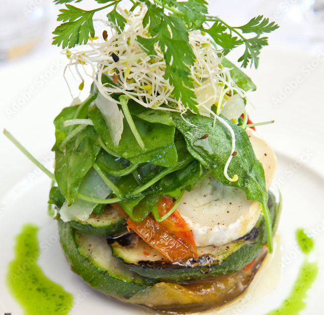 - Millefeuille de courgettes au chèvre frais, crème fouettée à la menthe poivrée.