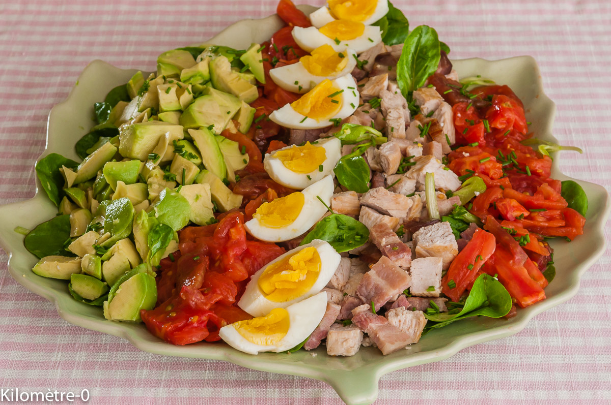 Allergènes: contient généralement œufs et moutarde dans la vinaigrette et peut contenir du lait (fromage) ou du poisson/crustacés selon les garnitures; risque de contamination croisée si préparé dans un atelier manipulant d’autres allergènes.