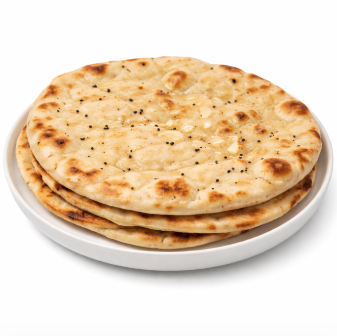 Le naan nature est un pain plat indien moelleux et léger, traditionnellement cuit dans un tandoor. Sa composition type comprend de la farine de blé (gluten), de la levure ou d’un pré-ferment, du sel et de l’eau, auxquels on peut ajouter du yaourt nature pour apporter de l’onctuosité et favoriser le développement de la mie, ainsi qu’un peu de ghee ou d’huile pour enrichir la texture. La pâte est pétrie, laissée à lever, puis façonnée en galettes et cuite dans le tandoor jusqu’à ce qu’elle soit gonflée, légèrement dorée et parfumée. Le naan nature se sert chaud, souvent nappé d’un peu de beurre ou de ghee et accompagné de currys, dal ou plats grillés, pour absorber les sauces et apporter une douceur contrastant avec les épices.