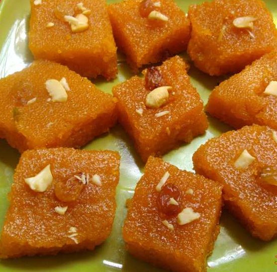 Le sooji halwa (ou suji halwa) est un dessert indien réconfortant et aromatique, réalisé principalement à partir de semoule fine (sooji) que l’on fait revenir dans du ghee jusqu’à ce qu’elle parfume et dore légèrement. On ajoute ensuite un mélange d’eau ou de lait et de sucre, puis on laisse mijoter à feu doux jusqu’à obtenir une texture épaisse et veloutée. Le parfum est renforcé par la cardamome en poudre et le safran, avec parfois une touche de lait de coco ou des raisins secs pour plus de douceur. On peut aussi parsemer de noix de coco râpée ou de fruits à coque concassés en garnish. Servi chaud ou tiède, il se marie à merveille avec des plats épicés et constitue une finition douce et généreuse en fin de repas.