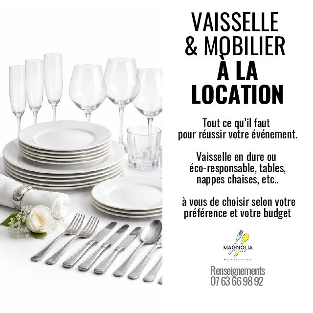Nous mettons à votre disposition une large sélection de vaisselle, verrerie, couverts et accessoires de table pour sublimer vos réceptions. Assiettes élégantes, verres adaptés à chaque boisson, couverts de qualité, plateaux de service et éléments de présentation sont choisis avec soin afin d’apporter harmonie et raffinement à votre événement.