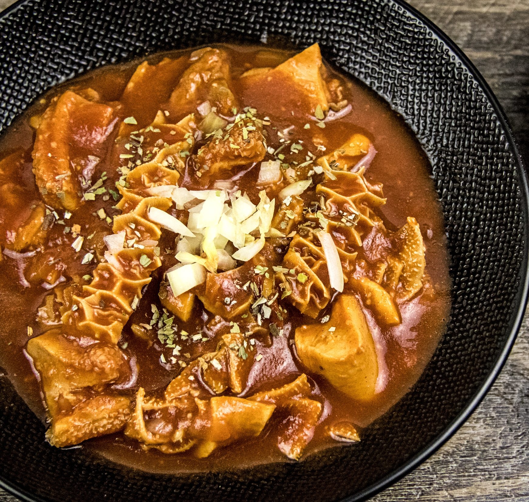 Allergènes: contient des tripes (protéine animale); peut contenir du gluten si épaissi avec de la farine, et peut laisser des traces de lait ou d’œufs selon les variantes et les méthodes de production, avec un risque de contamination croisée si préparé dans un atelier manipulant d’autres allergènes.